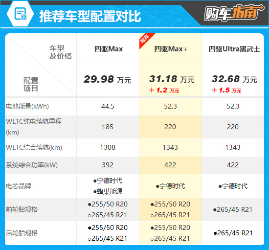 指导价为31.18万元的四驱Max+是本次的推荐车型。通过配置对比可以看出,推荐车型相比入门版车型,首先电池能量提升至52.3kWh,使其WLTC纯电续航里程达到220km,对于大多数用户来说,充满一次电基本能够满足一周的通勤使用,有效节约用车成本。其次,推荐车型的系统综合功率提升至422kW。售价仅比入门版车型多1.2万元,绝对物超所值。