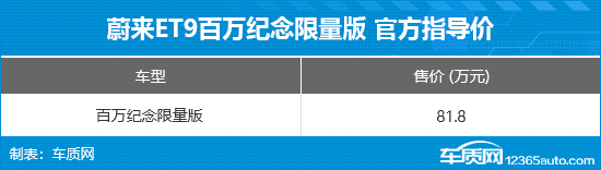 1月7日,蔚来ET9百万纪念限量版车型正式上市。新车定位纯电大型车,专为纪念蔚来品牌第100万台量产车下线而打造,具有非凡的收藏意义。此次新车共限量发售9台,售价81.8万元,采用电池租赁方式购车,售价为71万元。