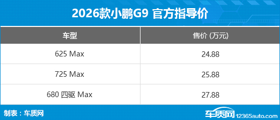 1月8日,2026款小鹏G9正式上市,新车共推出3款车型,官方指导价为24.88-27.88万元。同时,官方还推出购车礼、装备升级礼等多项限时权益。