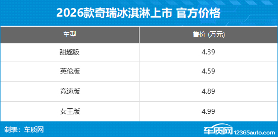 1月10日,2026款奇瑞冰淇淋正式上市,新车推出甜趣版、英伦版、竞速版、女王版四款车型,市场指导价4.39-4.99万元,叠加报废双补政策后入门价低至3.4万元,限时增购价与置换双补价同步优惠,性价比突出。