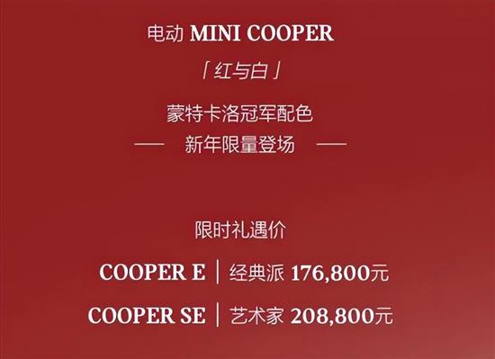 1月8日,电动MINI COOPER蒙特卡洛冠军配色车型正式上市,并同步开启限时礼遇,COOPER E经典派售价17.68万元,COOPER SE艺术家售价20.88万元。据悉,该车是为了纪念1964年MINI首次夺冠蒙特卡洛拉力赛。