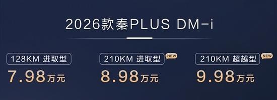 1月8日,2026款比亚迪秦PLUS DM-i正式上市,新车共推出3款配置,官方指导价为7.98-9.98万元。作为年度改款车型,新车重点针对动力与续航进行了升级,提供CLTC纯电续航128km和210km两种版本可选。