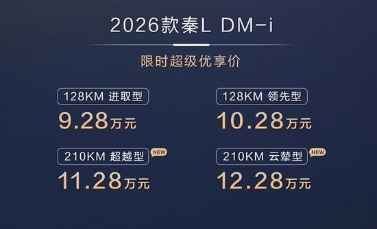 1月8日,2026款比亚迪秦L DM-i正式上市,新车共推出4款配置,官方指导价为9.68-12.68万元,同时还提供限时超级优享价,价格区间为9.28-12.28万元。本次年度改款的核心变化集中在续航与配置层面,新增210km长续航版本,电池容量提升至25.28kWh,并同步带来多项舒适与底盘技术升级。