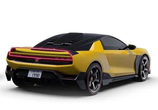 从外观来看,NSX Tribute在细节层面极具辨识度。前脸以“H”形结构强化品牌符号,并搭配红色本田标识,传递出鲜明的致敬意味。车顶进气口造型直接取材自NSX-R GT,强调高性能属性。车身侧面大量运用空气动力学元素,C柱区域采用悬浮式进气口设计,配合前19英寸、后20英寸轮毂,营造出极具张力的车身姿态。车尾部分同样充满赛道气息,大尺寸固定扰流板、环形尾灯以及下方夸张的扩散器组合,使整车视觉重心更加贴近地面。