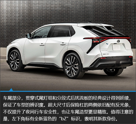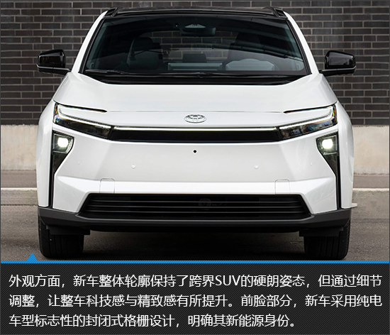 2026款丰田bZ延续跨界SUV经典轮廓形态,通过前脸造型与灯光系统的精细化调整强化科技感与精致感,同时优化车身细节设计,进一步提升产品辨识度与视觉协调性。