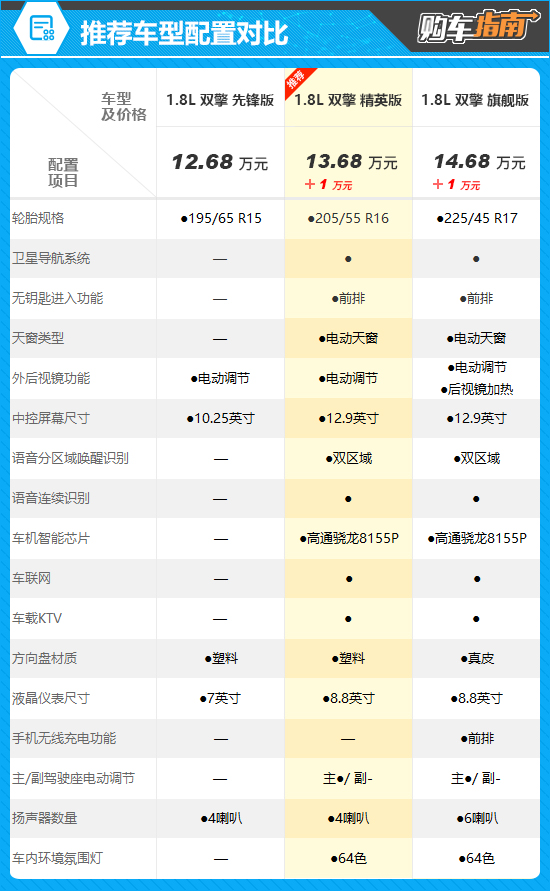 推荐车型为1.8L双擎精英版,售价13.68万元,厂家直销价10.5万元。相较入门车型,其不仅换装了更具运动感的16英寸铝合金轮毂,而且还新增多项实用性配置,包括卫星导航系统、前排无钥匙进入功能、电动天窗以及主驾驶座电动调节。此外,其还升级为12.9英寸中控屏,内置高通骁龙8155P芯片,支持双区域语音唤醒识别,并新增车联网以及车载KTV功能。虽然1万元的差价对于这个级别的车型来说比较敏感,但是上述升级确实能够带来更好的用车体验,因此非常值得入手。