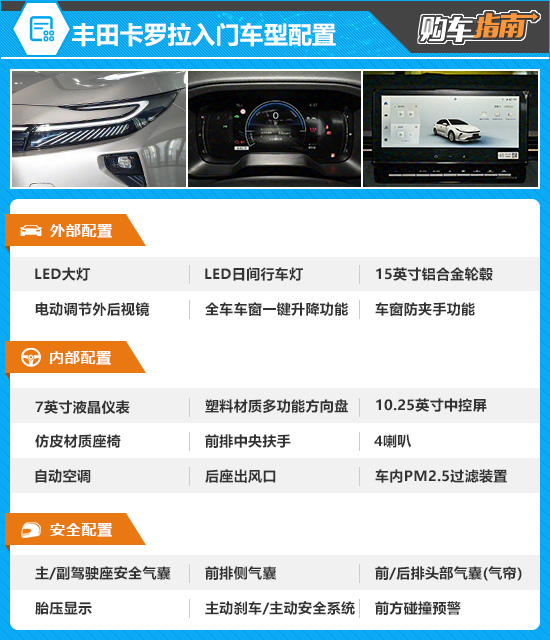 需要说明的是,考虑到大部分消费者还是更加关注丰田卡罗拉的双擎版本,因此相对小众的1.2T和2.0L车型不做推荐,重点关注1.8L双擎版车型。