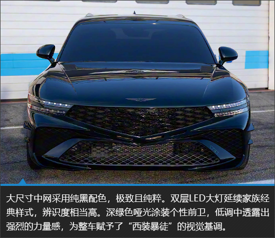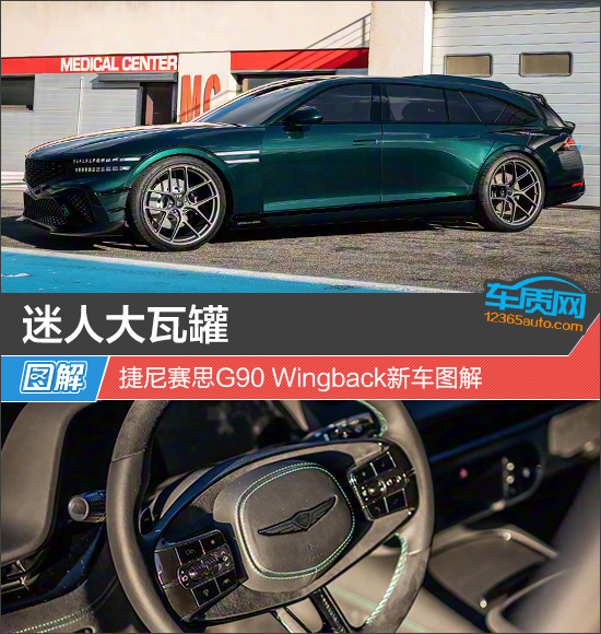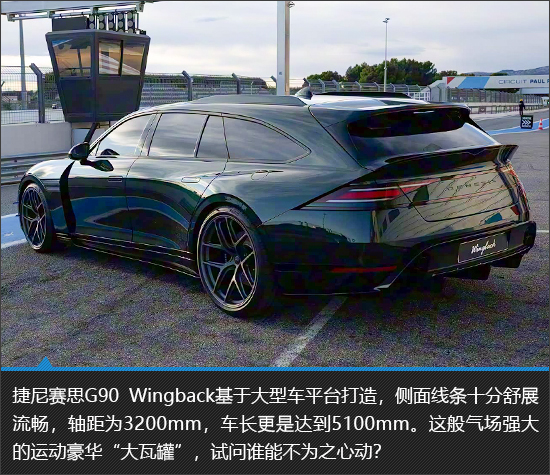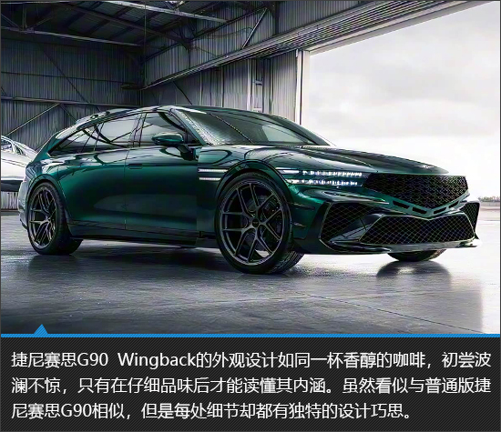 捷尼赛思G90 Wingback在外观设计方面实现了品牌经典元素、旅行车特质以及性能感的有机融合。短前悬、长轴距与长后悬的黄金比例组合,搭配由B柱向后自然延伸并流畅下滑的车顶线条,勾勒出十分优雅的整体轮廓,极具视觉张力。另外值得一提的是,作为一款概念车,其所有设计元素都非常“接地气”,量产难度几乎可以忽略不计。