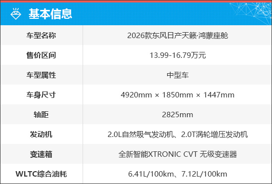 2026款东风日产天籁共推出4款车型,售价区间为13.99-16.79万元,上市限时价12.99-15.79万元。同时,官方还推出了多项限时购车权益(详情请咨询当地经销商)。