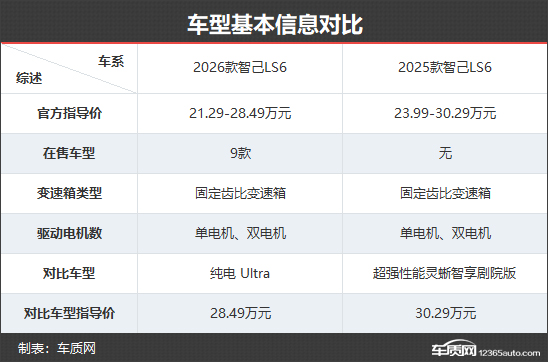 2026款智己LS6共有10款车型,目前在售9款,官方指导价为21.29-28.49万元。相较老款车型而言,入门门槛和顶配车型价格均有所下调。本次对比选择了新老款纯电版本的顶配车型,以便能够更加直观地看出在配置层面的具体差异。
