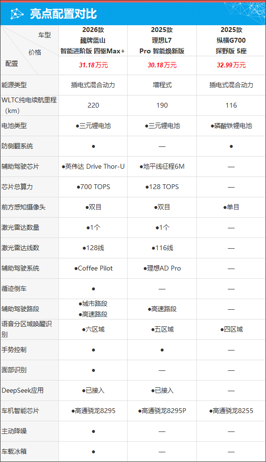 魏牌蓝山智能进阶版定位为中大型SUV,搭载插电式混合动力系统。参考车型定位以及价格区间,最终为其挑选的竞品车型分别是理想L7和纵横G700。