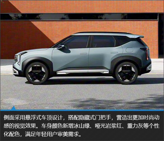 全新一代起亚Seltos通过锐利的线条切割、个性化配色及专属外观套件,成功塑造了“小号狮铂拓界”的硬核形象,同时隐藏式门把手、低风阻设计等细节也体现了对新能源时代的审美思考。