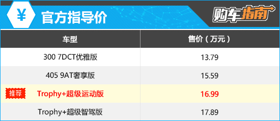 轮毂方面,300 7DCT优雅版和405 9AT奢享版配备19英寸耀银多辐轮毂,视觉效果出色,与之匹配的轮胎规格为245/40 R19;Trophy+超级运动版和Trophy+超级智驾版配备19英寸暗影猎风多辐轮毂,采用了熏黑处理,更为动感,与之匹配的轮胎规格为245/40 R19。