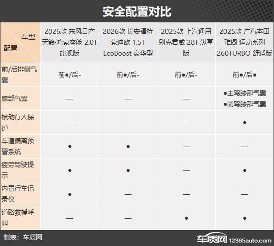 在安全配置方面,广汽本田雅阁整体最为全面,尤其在被动安全层面,是唯一配备后排侧气囊、主副驾膝部气囊以及被动行人保护的车型。东风日产天籁在主动安全配置上更具优势,而别克君威则缺失多项相关配置,整体表现相对一般。