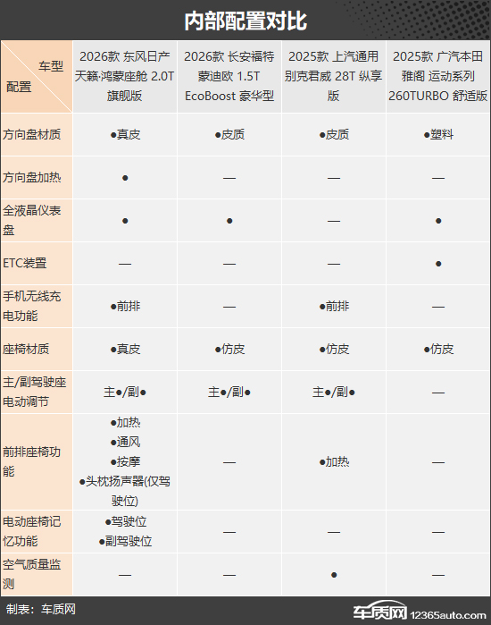 在内部配置方面,东风日产天籁优势十分明显,其独享多项功能,在质感、舒适性和便利性方面均能提供不错的体验。其他三款车型整体实力接近,其中别克君威配备空气质量监测功能,广汽本田雅阁则提供ETC装置,在部分细节配置上相比长安福特蒙迪欧更具亮点。
