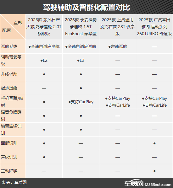 辅助驾驶方面,四款车型差异较为明显。东风日产天籁和长安福特蒙迪欧均具备L2级辅助驾驶能力,但后者可实现的功能更为丰富。别克君威仅提供定速巡航,而广汽本田雅阁未配备辅助驾驶相关功能。
