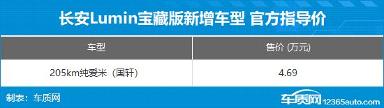 1月22日,长安Lumin宝藏版新增车型——205km纯爱米正式上市,官方指导价4.69万元。作为全系入门车型,新车针对配置进行了调整,动力部分依旧搭载前置单电机,CLTC纯电续航里程205km。