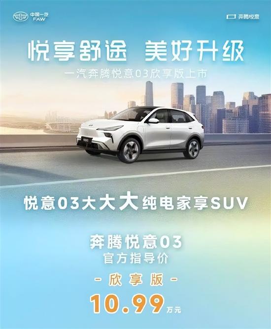 1月22日,奔腾悦意03欣享版车型正式上市,指导价10.99万元。同时,官方还推出了限时购车权益,置换购车享5000元厂家补贴、额外提供4000元购置税补贴以及支持60期0息贷款,月供低至千元级。