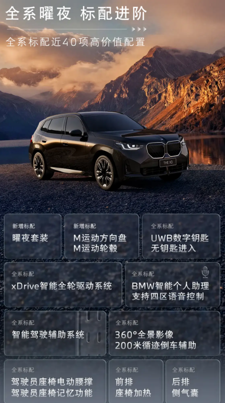 配置升级幅度显著,3系与i3全系标配前排座椅加热、驾驶员座椅电动腰撑、电动尾门、5G网络、智能泊车辅助系统Plus(含360°全景影像)及主动巡航控制系统,中高配车型搭载HUD全彩平视系统,顶配提供碳纤维+水晶内饰组件。X3则全系标配曜夜套装、M运动方向盘/轮毂、前排座椅加热、驾驶员座椅电动腰撑+记忆、四音区语音控制、后排气囊、360°全景影像+200米循迹倒车等近40项配置,中配加配HUD,顶配可免费选装磨砂灰车漆与21英寸轮毂。此外,3系全系沿用2.0T+8AT动力,X3标配xDrive智能四驱,进一步强化驾控属性。