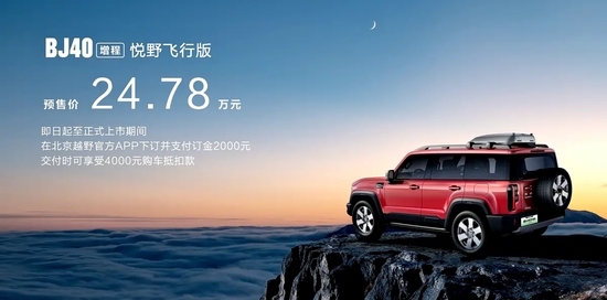 1月27日,北京越野BJ40增程悦野飞行版正式开启预售,预售价为24.78万元。作为BJ40家族中唯一具备“空中拓展”能力的车型,新车将硬派越野与低空科技深度融合,为户外摄影及复杂路况侦测提供了全新的解决方案。