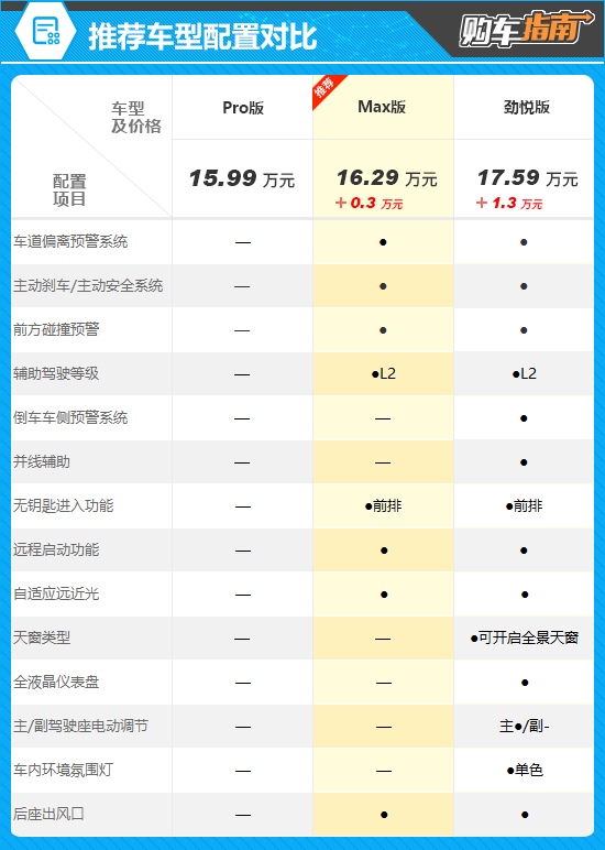 从全系配置来看,最值得推荐的是Max版。相比入门车型,它新增了当下消费者普遍关注的L2级辅助驾驶,能够带来更有科技感的驾乘体验。同时还新增加前排无钥匙进入功能、远程启动功能、自适应远近光以及后座出风口,整体用车体验提升明显,售价仅需多花0.3万元,性价比非常突出。