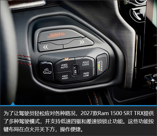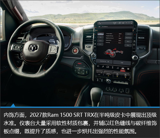 不难看出,即便是2027款Ram 1500 SRT TRX这样的“洪水猛兽”,也并未舍弃豪华与舒适这两项核心素质。同时,它顺应时代趋势,引入多项智能科技配置,在极致野性之中融入现代感,实现了“原始力量”与“现代科技”的巧妙融合。