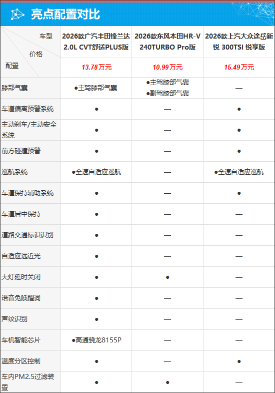 纵观国内合资紧凑型SUV市场,与2026款广汽丰田锋兰达(以下简称:丰田锋兰达)定位相近且价格相当的车型并不多,综合考虑销量、口碑和品牌形象等多方面因素,此次与丰田锋兰达进行对比的车型是2026款东风本田HR-V(以下简称:本田HR-V)和2026款上汽大众途岳新锐(以下简称:大众途岳新锐)。