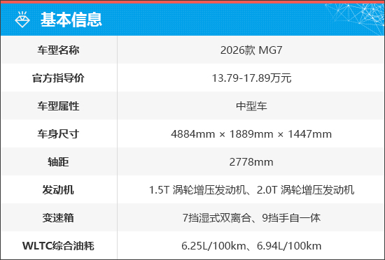 2026款MG7共推出4款车型,官方指导价13.79-17.89万元。新车搭载1.5T发动机和2.0T发动机两种动力,分别匹配7挡湿式双离合变速箱和9挡手自一体变速箱。