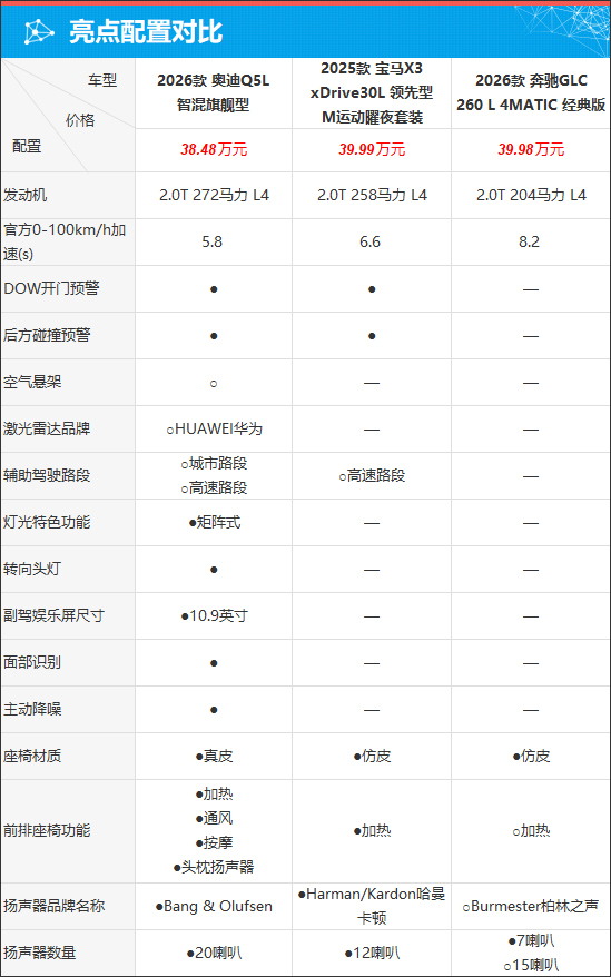 具体到车辆配置层面,我们挑选了售价尽可能相近的车型。通过表格对比来看,虽然三款车型均是采用2.0T发动机,但全新奥迪Q5的发动机马力最大,零百加速仅需5.8s,动力表现出色。此外,全新奥迪Q5L是唯一可以选装空气悬架以及华为乾崑智驾的车型,能够满足不同消费者用车需求。同时,其还独占主动降噪、真皮材质座椅、前排座椅通风/按摩等功能,用车体验更为出众。相比之下,奔驰GLC的整体配置表现稍显逊色。