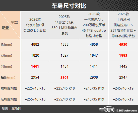 作为传统豪华品牌旗下的中型车,在车身尺寸方面确实都比较克制,并未出现那种“不讲武德”的情况。对比来看,长度和宽度表现最优的都是凯迪拉克CT5,奔驰C级的车身高度最高,而轴距表现最好的是宝马3系。
