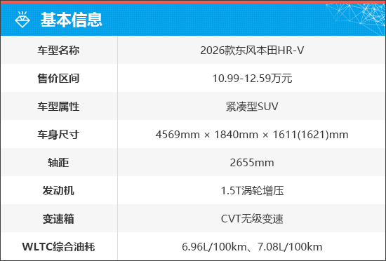 2026款东风本田HR-V共推出3款车型,售价区间10.99-12.59万元,均搭载1.5T缸内直喷涡轮增压发动机和CVT变速箱的动力组合。