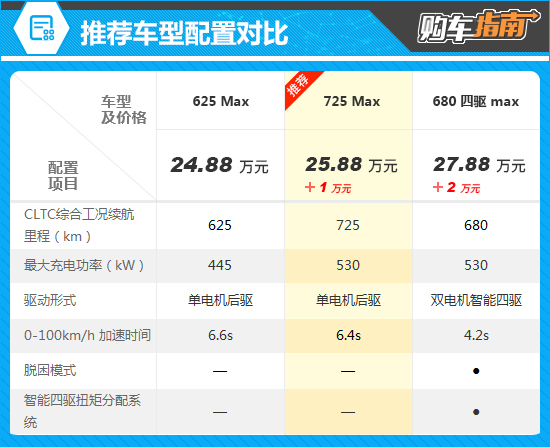 通过对比配置不难发现,推荐的725Max比入门的625Max续航里程更长,而且还支持更高的充电功率,动力体验也有小幅提升,结合1万元的差价,物有所值。