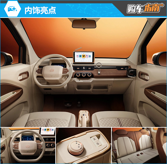 外观颜色方面,甜趣版提供香芋紫、浅藕色、椰子白、榛果米、抹茶青5种车漆可选,均搭配黑色车顶;英伦版以榛果米作为基础色,并在车顶和轮毂等部位加入奶茶棕装饰;竞速版采用红色和冷萃黑双拼色设计;女王版则采用榛果米以及绿色涂装。