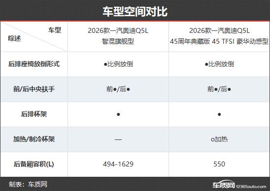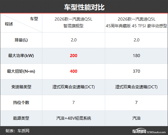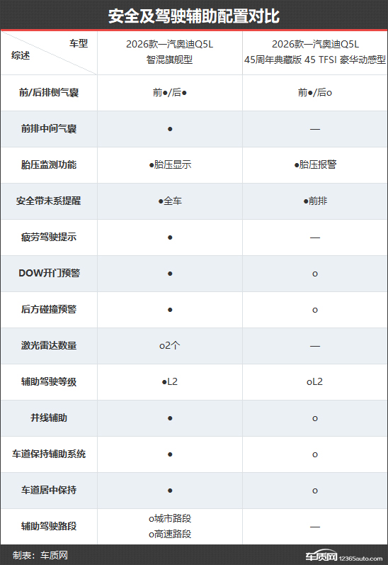 由于采用新老同堂销售策略,因此2026款一汽奥迪Q5L目前共有7款在售车型。其中,4款车型为全新换代版本,官方指导价为30.98-38.48万元。相较老款车型(2026款45周年典藏版)而言,入门门槛和顶配车型价格均有所下调。本次对比选择了新老款的顶配车型,以便更直观地体现二者在配置层面的具体差异。