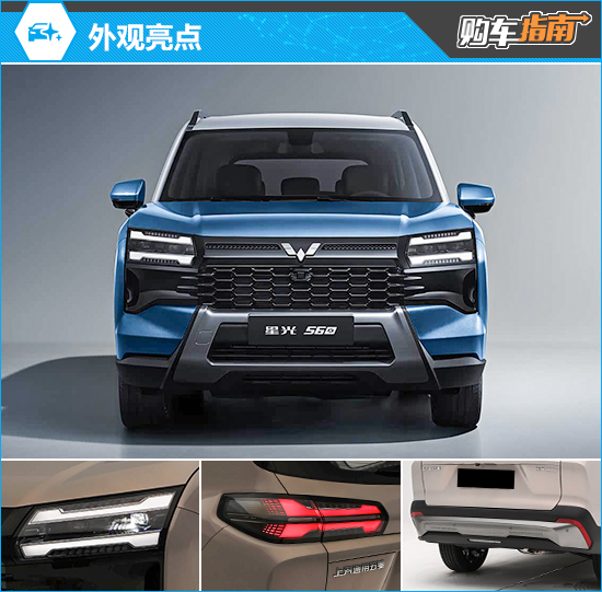 五菱星光560可视为宏光侠概念车的量产版本,其在外观设计方面基本延续后者方正硬朗的整体风格。前脸造型层次分明,黑色蜂窝状中网与大灯组融为一体,内置双层LED灯带,点亮效果十分出色。尾灯组造型与大灯组遥相呼应,同样配备双层LED灯带,辨识度极高。细节部分,新车在前/后包围处均配备黑色饰板以及银色饰条,硬朗大气之余也增添了些许精致感。尺寸方面,新车长宽高分别为4745mm*1850mm*1755mm,轴距2810mm。