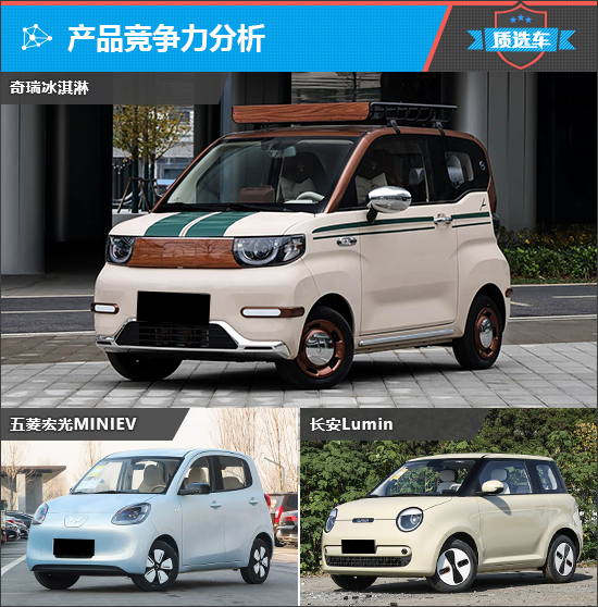 奇瑞冰淇淋定位为纯电动微型车,主要面对的是城市代步通勤的使用场景。考虑到品牌影响力、车型定位以及售价区间,最终我为其挑选的竞品车型分别是五菱宏光MINIEV和长安Lumin。