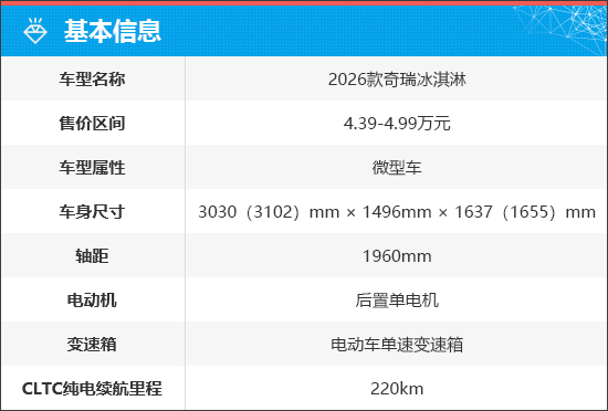 2026款奇瑞冰淇淋共推出4款配置车型,官方指导价4.39-4.99万元,限时增购价4.09-4.69万元。此外,官方还推出了诸多优惠政策,包括补贴礼、金融礼、能量礼、补能礼、流量礼、质保礼和呵护礼(详情请咨询当地经销商)。