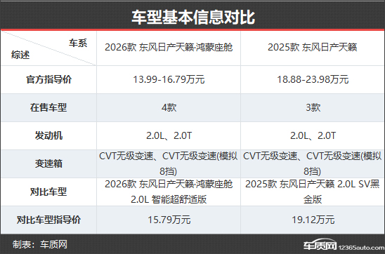 2026款东风日产天籁共推出4款车型,较2025款车型数量增加1款。指导价方面,新款车型整体下探,顶配车型的售价甚至低于老款入门版本,价格吸引力明显提升。本次对比选取的两款车型均为2.0L高配版本,便于更直观地呈现新老款车型在配置层面的差异。