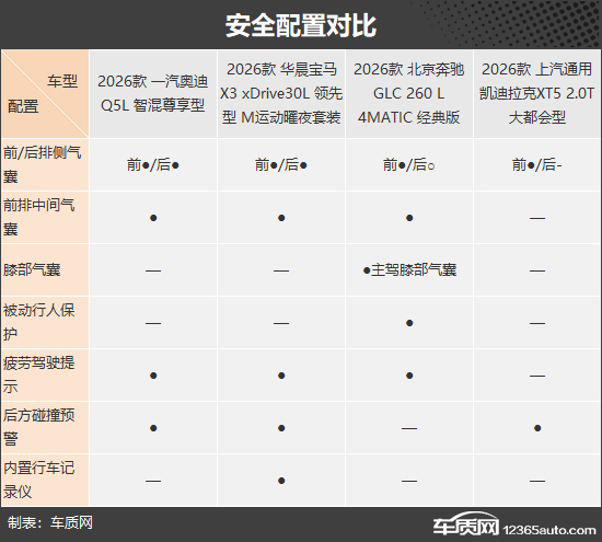 安全配置方面,宝马X3可提供相对全面的防护,其独享内置行车记录仪,主动安全的优势较为明显;而奔驰GLC L则是唯一配备主驾驶膝部气囊和被动行人保护的车型。相比之下,凯迪拉克XT5在主、被动安全配置数量上有所欠缺,略逊一筹。
