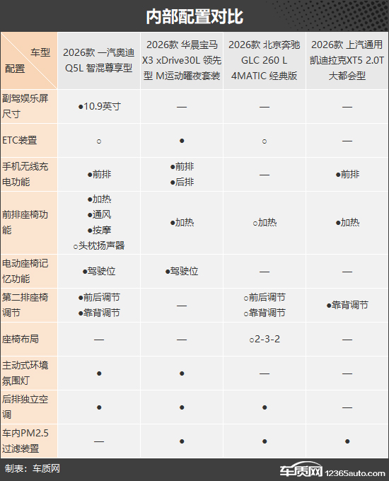 在内部配置方面,奥迪Q5L与宝马X3的整体表现更为突出。前者不仅配备了副驾娱乐屏,座椅相关功能也较为丰富;后者则在便利性配置上占优,是四款车型中唯一标配ETC装置和后排手机无线充电的车型。相比之下,奔驰GLC L的基础配置略显保守,部分功能需要通过选装来进一步完善。