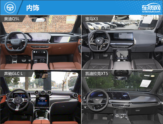 与近几年不少品牌内饰设计逐渐趋同不同,本次推荐的四款车型在座舱设计上都展现出了鲜明的品牌个性,并未盲目跟风。奥迪Q5L与宝马X3均采用双联屏布局,其中,前者还提供副驾娱乐屏,在科技氛围的营造上更为到位;而宝马X3被戏称为“兰花指”的电子挡杆设计精致,与其魁梧的车身形成有趣反差。凯迪拉克XT5配备33英寸巨幅车机大屏,视觉冲击力强,同时屏幕下方保留了大量实体按键,操作便捷性更佳。奔驰GLC L则是四款车型中唯一采用纵向中控屏的产品,带盖板的杯架兼顾实用与整洁,细节处理更显考究。