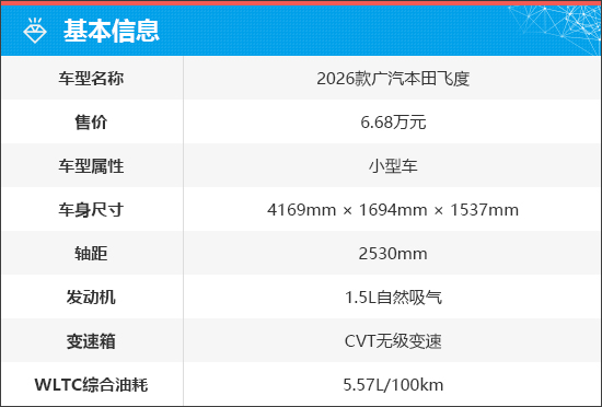 2026款广汽本田飞度仅推出1款车型,售价6.68万元,搭载1.5L自然吸气发动机和CVT变速箱的动力组合。
