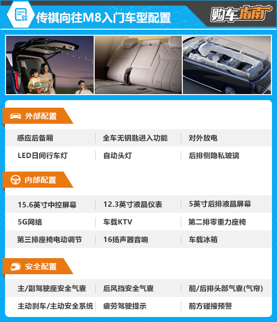 2026款传祺向往M8此次共推出3款车型(2026款传祺向往M8目前在售有5款车型,此次推荐为2025年12月30日上市的3款与华为合作的车型),官方指导价30.99-38.99万元。同时,官网限时推出尊享金融礼、轻松置换礼、乐享智联礼等多项购车权益(详情请咨询当地经销商)。