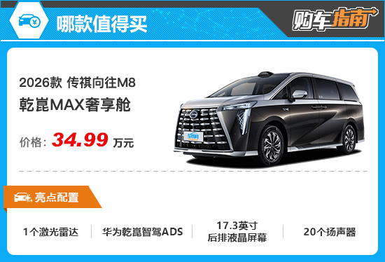 综合来看,对于2026款传祺向往M8的购买建议,重点推荐乾崑MAX奢享舱,消费者在购买时可优先考虑。