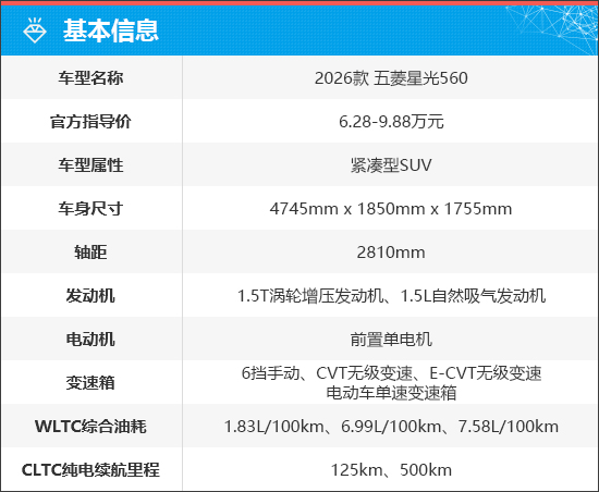 2026年1月15日,星光560正式上市,共推出4款车型,售价区间为6.28-9.88万元,置换补贴价为5.98-9.58万元。同时,官方还推出守护礼、质保礼、金融礼等购车权益(详情请咨询当地经销商)。