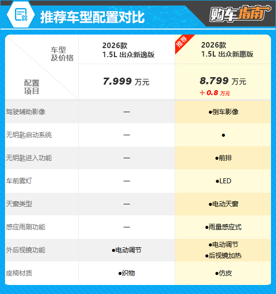 目前在售的2款车型中,更推荐1.5L 出众新愿版。相较于入门版车型,这款推荐车型在驾驶硬件及便利性配置上均有提升,例如增加倒车影像、无钥匙启动系统、电动天窗等实用配置,而价格仅高出0.8万元,可谓物超所值。