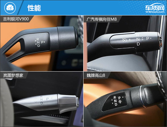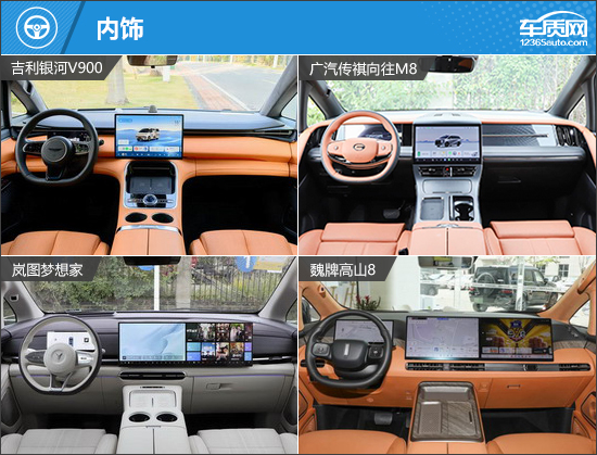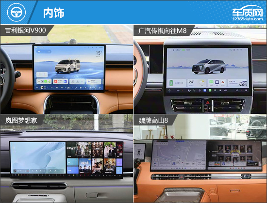 内饰方面,四款车型均主打豪华舒适,并非常注重科技感的营造。银河V900采用环抱式座舱布局,“步步高升”仪表台设计的灵感源自中国古典建筑的层叠阶梯礼序。传祺向往M8中控台处采用“一横两纵”设计,整合储物格、无线充电面板及双杯架,兼顾实用与美观。岚图梦想家和魏牌高山8设计风格相似,均配备副驾娱乐屏。换挡形式方面,四款车型均采用电子式怀挡换挡,不仅更具精致感,也有助于前排空间的优化。