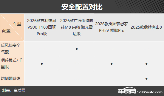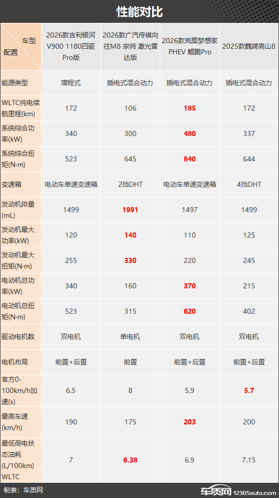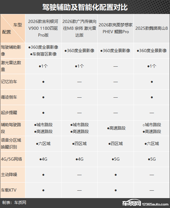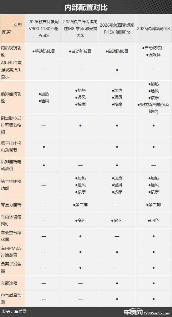 本次挑选的四款车型分别为2026款吉利银河V900 1180四驱Pro版(以下称:银河V900)、2026款广汽传祺向往M8 宗师 激光雷达版(以下称:传祺向往M8)、2026款岚图梦想家 PHEV 鲲鹏Pro(以下称:岚图梦想家)和2025款魏牌高山8(以下称:魏牌高山8)。四款车型产品特点和市场定位接近,售价差距也不是很大(由于目前图片数量较少,因此部分车型的图片并不是相对应的具体款型)。