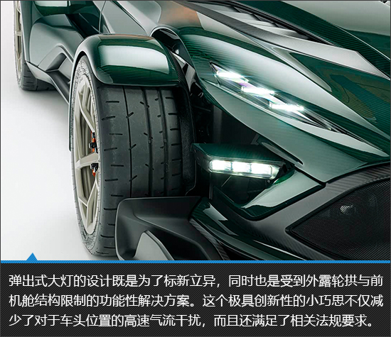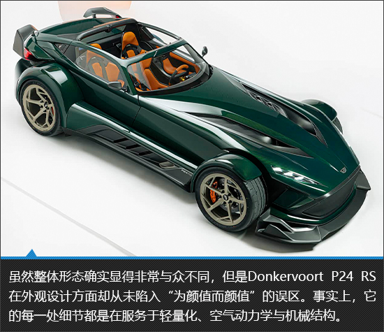 外观设计方面,Donkervoort P24 RS大胆融合了复古基因与未来美学,看似矛盾的思想碰撞,最终却呈现出极具张力的独特视觉效果。或许你未必偏爱这份前卫与大胆的造型表达,但不可否认,它的设计绝无平庸与丑陋可言。在我看来,这款小跑车还是拥有着许多出彩的小巧思,例如弹出式大灯组、外露式前轮布局以及集成了排气孔与散热开口的侧裙,每一处设计都兼顾视觉效果与功能性。