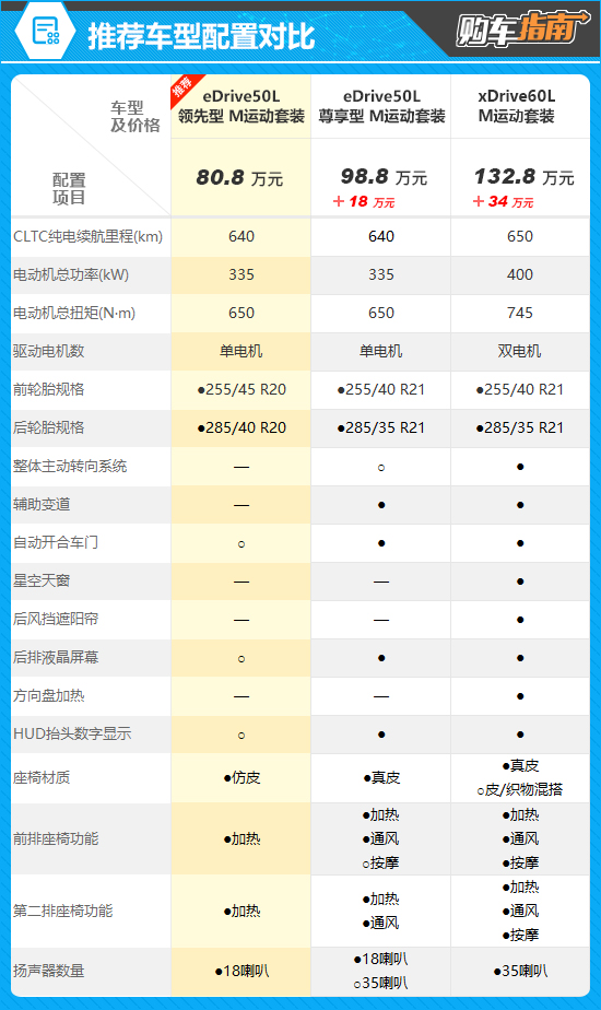 xDrive60L M运动套装相比eDrive50L尊享型M运动套装在配置上进一步提升,不仅满足了车内乘员对舒适、娱乐方面的追求,更是将豪华氛围推向了极致。同时,在双电机的加持下,其动力表现更加充沛,CLTC纯电续航里程也有所提升,驾驶体验更具激情。不过,考虑到34万元的价差,xDrive60L M运动套装更适合预算充足、且偏好高规格配置的用户选择。